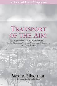 Into this atmosphere arrives Maxine Silverman’s Transport of the Aim (Parallel Press, 2013), a collage of poems in the voices of Dickinson, Celia Thaxter, and other poetic contemporaries. The voice of journalist and 19th century abolitionist Thomas Wentworth Higginson, a mentor to Thaxter and pen pal of Dickinson, is also present.
